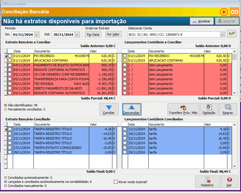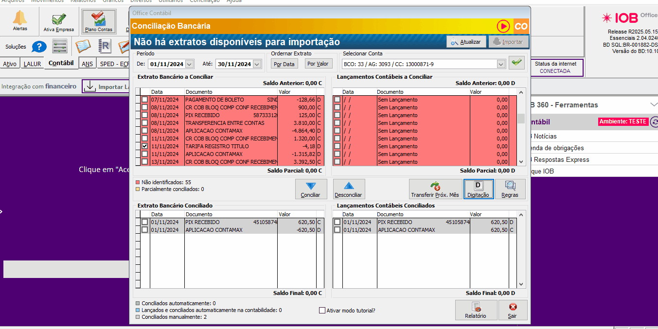 Realize a conciliação dos lançamento , selecione o botão "Digitação" da tela de conciliação, realize a