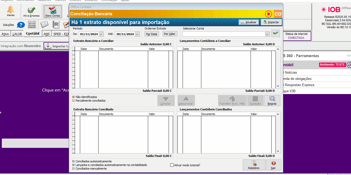 Acessar o menu "Conciliação -> conciliação bancaria " realize a importação de um cliente