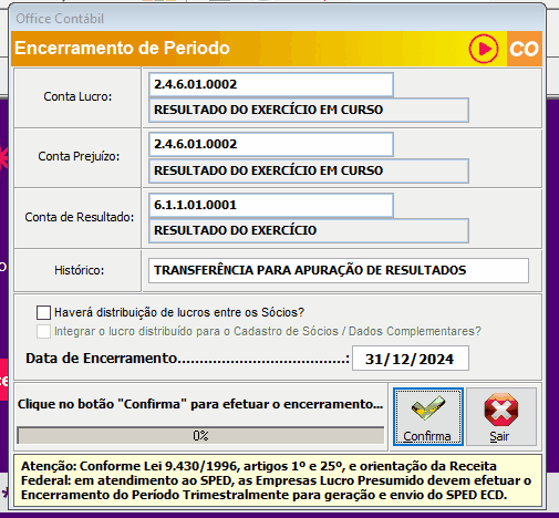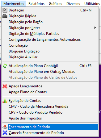 Acessar o menu "Movimentos -> Encerramento do periodo -> e realize o encerramento de um periodo.