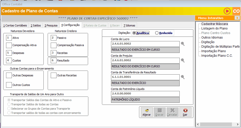 Acessar o menu "Arquivos -> Plano contabil> na tela " 4 configuração" e altere as conta do grupo "Natureza